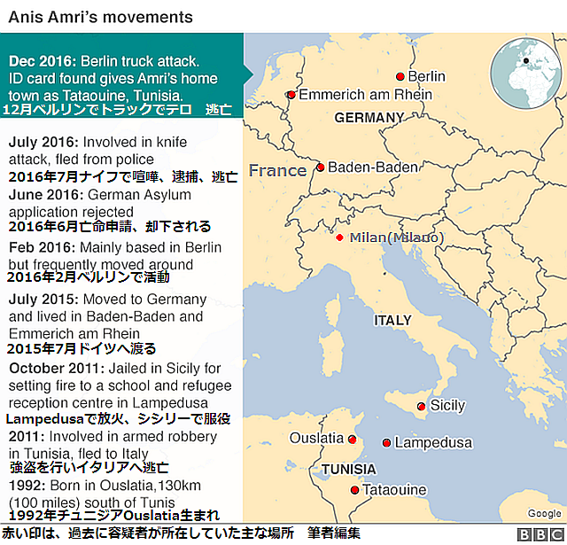 左は、BBCの容疑者の大まかな行動をまとめた図を編集したもので、犯罪歴があっても、EU圏でかなり自由に行動できていたことが分かる。容疑者には、2011年にチュニジアTunisiaで強盗を働いた容疑があり、その為かイタリー入国を目指してLampedusa 島へ上陸する。そこでも破壊行為や強盗を行ない、イタリーのシシリーSicilyで刑務所に収監されていた前歴がある。服役中も暴力的だったと記録されていたようだ。服役後、イタリー国外への退去命令を受け、2015年7月ドイツへ入国して2016年4月に亡命申請をしたが6月に却下され、ここでもナイフを持った喧嘩で7月に逮捕されたが出頭命令を無視し、さらに8月には偽造イタリーパスポート所持で逮捕されるも、なぜか裁判所は釈放し、12月初めから行方が分からなくなる。このころ、現在服役中の、IS兵士を違法にドイツでリクルートしていた男と接触していたことが判明している。この男に容疑者もシリア行きを薦められたが、容疑者がドイツでの活動を望んだと言われる。これほど犯歴と疑惑の多い容疑者に対し、通信傍受などで監視はしていたというドイツ当局は、彼が有効な身分証を持っていないことでドイツから追放、または強制送還できなかったと説明している。メルケル首相の法や規則の見直しも、このことを指摘していると思われる。 参照記事 参照記事 参照記事