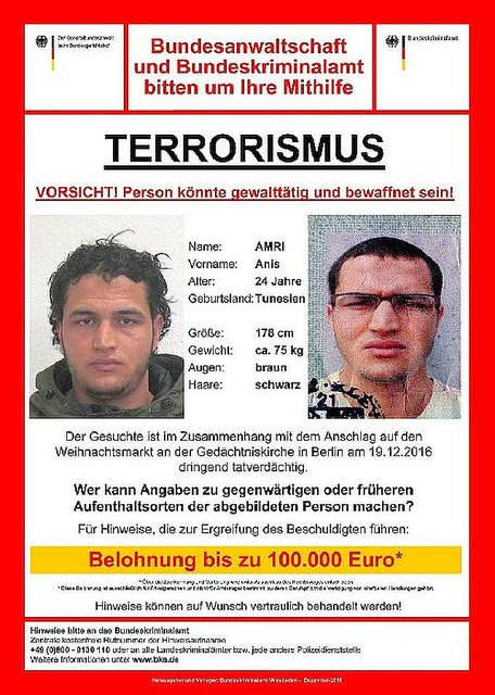 ドイツ・ベルリンのクリスマス市Christmas marketにトラックが突っ込み12人が死亡した件で、地元警察はチュニジアTunisiaから入国し、亡命を希望していた男を、IS組織に関わる犯行の主犯として行方を追っていると2016年12月21日、当局者や安全保障関係筋が明らかにし、逮捕に繋がる情報に対し10万ユーロ100,000 euros(約1200万円)の懸賞金付きで指名手配した。暴力的で武装しているとコメントされている。右