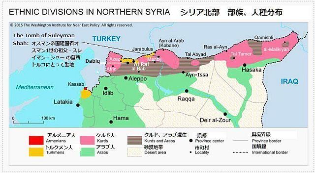 でもトルコ側は否定しているが、当時トルコがクルドと敵対するISに支援物資を流していたとの話があり、原油の支払いとして行なわれて可能性は十分ある。この北上ルートが可能な背景には、右の民族、人種分布が参考になる。当時Tal Abyadは、ピンク色のクルド人地域から外れていて、形だけのトルコ側国境検問は、トルコ情報部の指示で原油の輸送路としてISの物資、兵員の通過を黙認し、エルドアン大統領の息子Bilal