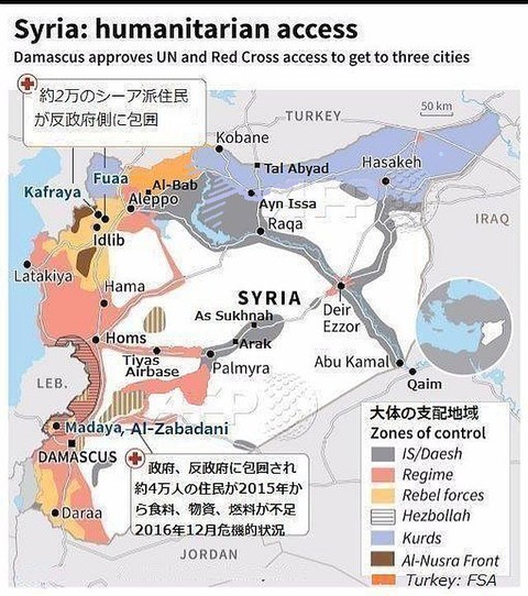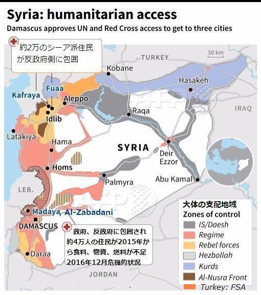 シリア内では、レバノンに近い Madaya 、Al-Zabadani地域の住民も食料、更に積雪を前に燃料の不足から住民の避難や人道支援が必要とされている。この地域は、反政府側、シリア政府側に包囲され孤立化し、多くの病人も出ているといわれる。シリア国内には、支援を必要とする地域が40箇所程もあるとされ,、アレッポからの難民が到着する予定のKefraya 、 Fua(Fuaa,Foua)村は、そこのシーア派(Twelverと英語表記される十二イマーム派、レバノンからのシーア派 分布図 参照記事)住民が反政府側に包囲されているといわれている地域で、今回、政府側の要求で、シーア派村民の避難(村からの脱出)を受け入れることを反政府側が17日に合意していた。19日の記事では、イドリブ