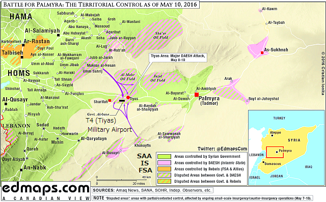 現地2016年12月19日、相当に大規模なISの攻撃が、パルミラPalmyraからホムスHomsの街道上のほぼ中間にあるティアスTiyasで行なわれ、近くのティアス空軍基地T4 (Tiyas) Military Airportは奪還される危機を脱し、一時包囲された水源管理施設T-4 Pump Stationもシリア軍SAA(Syrian Arab Army's)の地上軍と空軍により解放され、IS兵士50人以上を殺害し、戦車や自爆車輌を含む多数の装甲車を破壊したが、ISの攻撃の規模は、先の12月11日のパルミラ奪還攻撃に匹敵する激しいものだったと報告されている。さらにシリア軍は19日午後、基地の西部Al-Raddad( Sharifah近く)も制圧し、戦線を拡大した。