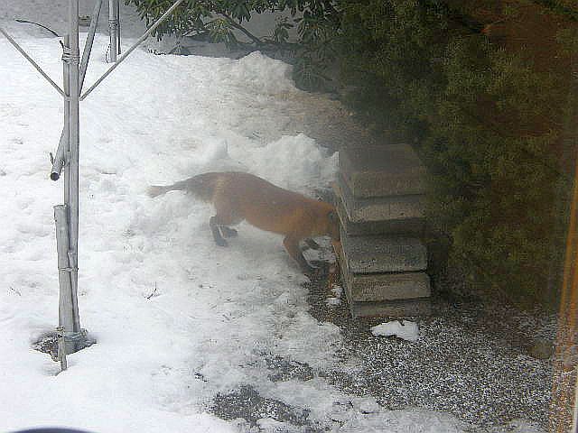 遅いときがあるが、これまでの経験では、こんな場合は恋人とデートに出かけたのだろう。デート中は食事は二の次で付近を散策する。残念ながら、このキツネも最近尻尾をダニにやられて毛が抜けているが、何とか回復して貰いたいものだ。ここまで筆者への警戒心が薄れるまで半年程掛かっている。我が家の西側の奥のヤブに住み、メスだろうと思っている。たまに東から、オスらしき別なキツネが姿を見せるが、まだ一緒に来たことは無い。数日前の昼間現れたときは、二階の窓からのぞく筆者と目が合ったが逃げる様子はなく、玄関から出ると玄関前まで確認しに来ていた。すっかりこちらが観察されていた様で、こちらの行動を読んでいる。同じ餌場にはキジの夫婦も来るので、仲良くしてもらいたいものだ。これまでの観察では、アオサギの群れの中を歩いていることもあり、鳥類を襲ったりする気配は無い。他の観察者の記録を見ても、よほど飢えない限り鳥を襲ったりはしないようだ。逆に、野ネズミなどの餌を横取りしようとするカラスが、キツネを攻撃するのは何度も見ている。毎日足跡で行動を見ているが、幸い人家のあるほうへは行っていないようで、我が家の周りを縄張りにして暮らしているようだ。