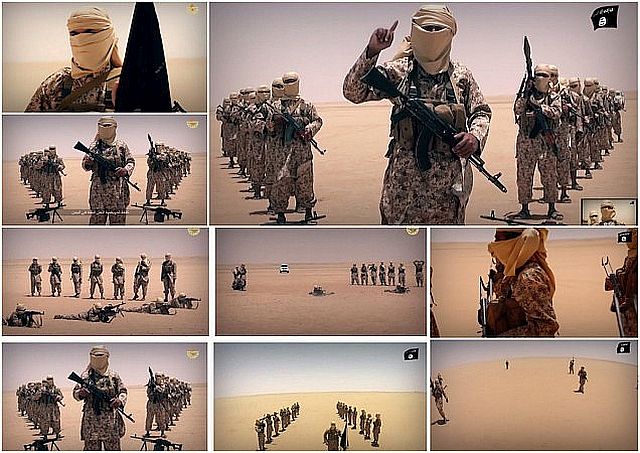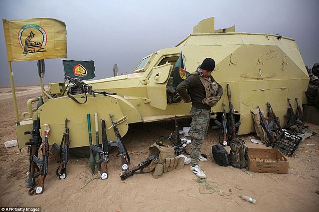 またイラク軍は、アンバル県Anbar province西部アカシャット砂漠Akashat desert(アル・カイムAl-Qaim南部と思われる)やal-Sakraで、ISの貯蔵弾薬や製造工場を空爆破壊したと公表している。写真は、砂漠のシーア派民兵組織「人民動員隊:People's Mobilization Forces、 Popular Mobilization Units」の装甲車。参照記事