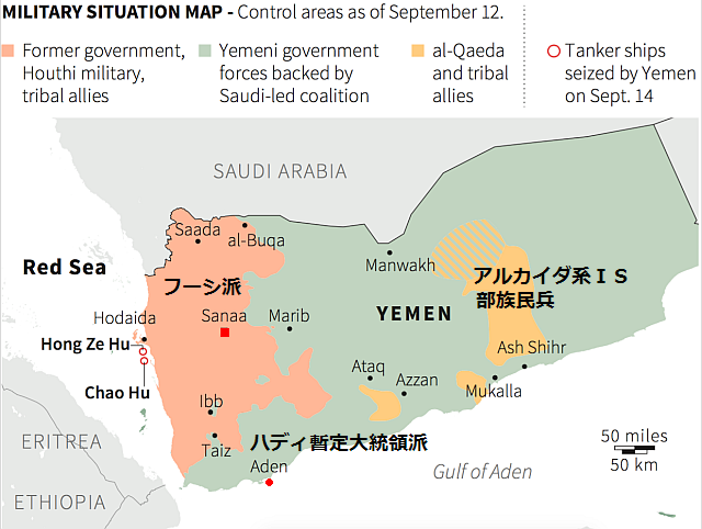 イエメンYemen(Jemen)では、サウジアラビア(米国支援)などが支えるスンニ派「ハディ Hadi暫定大統領派:正規イエメン軍」と、旧政権支持イラン支援シーア派反政府武装組織「フーシHouthi」との間で争いが続いている。首都サヌアSanaaはフーシが占拠しており、ハディ派はアデンAdenを拠点としている。イエメンでは、内戦により約1万人の死者が出ているほか、数百万人が支援を必要とする状況に陥っている。混戦状態の中、さらにイエメンでは特に南部でのアルカイダ(Al-Qaeda)系IS組織「アラビア半島のアルカーイダAQAP」が地場の反政府部族民兵と連携して支配地を拡大させ、戦況を更に複雑化させている。