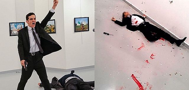 トルコの首都アンカラAnkaraで2016年12月19 日夕方、写真展「トルコ人から見たロシア"Russia through Turks' eyes"」の開幕式でスピーチしていたロシアのアンドレイ・カルロフ駐トルコ大使Russian ambassador to Turkey Andrey Karlov(62歳、2013年からトルコ駐在:写真右、暗殺直前の大使の後ろに暗殺者が写っている)が、男に突然後ろから銃撃され死亡した。男は