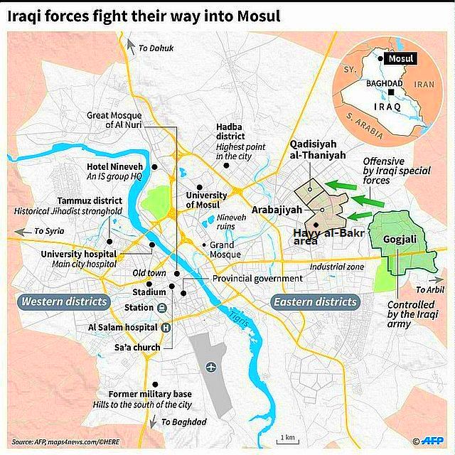 2016年12月26日:イラク軍は、モースル東部郊外のKokjali(Kukjali、Gogjali:この地域にイラク軍が作戦本部を置いている)がISの自爆攻撃を受けたことで、25日、ISが攻撃の拠点にしている、Gogjaliの南西に隣接するal-Quds neighborhoodへテロ特殊部隊が攻撃に出たと報じた。この付近はすでに、1ヶ月以上前に解放されたとされる地域。雨などの悪天候で中断されていたモースル北部、南東部へのイラク軍の地上攻撃、米国、有志国軍の空爆は23日再開された。参照記事 記録映像:Gogjali地域で捕獲されたIS