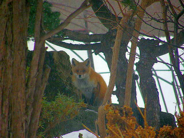 まだ名前は付けていないが、毎日来るキツネの写真がやっと撮れた。最近昼間にもたまに顔を出すようになり、こっちの口笛にも反応するようになった。今日は11時ころ姿を見せ、合図して餌を少し出したが、その間、中庭の木の下でこっちを見ていた。たまに夕方に来るのが
