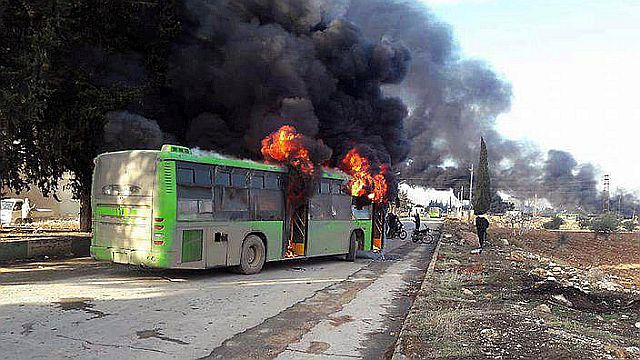 現地2016年12月18日、住民、反政府兵士避難のバスが到着し、アレッポ東部からの最終的な避難が再開された。妨害や発砲により死傷者を出したのはシーア派民兵と書かれているが、はっきり書けばイラン側指揮下のシーア派兵士、民兵の仕業だろうと、これまでの各地からの報告から推測できる。右は、アレッポから出発するバスの列。