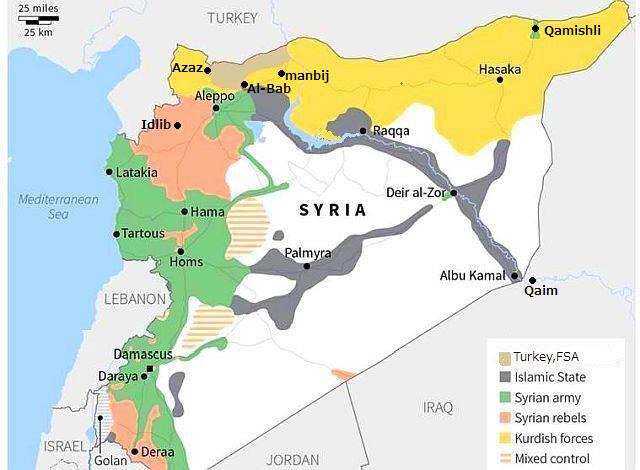 2017年2月27日:右下は27日付の戦況図で、デリゾールDeir Ezzor北部、クルド領内に反政府側Rebelsの支配地域を示す緑色があるが、詳しい説明は無い。トルコから支援を受ける反政府側FSAなのかとも思うが、それを示す記事は見当たらない?もしかしてミスなのか?最上部の戦況図とは出典が違うので、両方を見て判断するしかない。この下図でいくと、デリゾールのシリア軍SAAはISに完全に包囲されているが、物資は空輸で補給されている。ラッカと分断すべく、ユーフラテス川沿いの地域や道路に相当な空爆が行われている。ラッカ攻撃は、米軍支援のクルドSDFが主力で、ラッカの東西から攻撃をかけている。 地図の参照記事