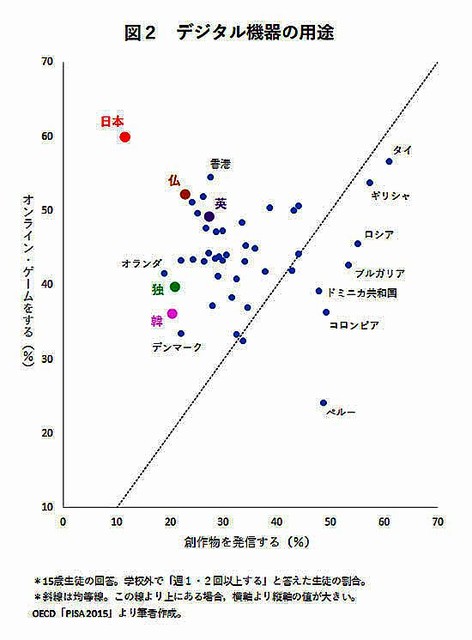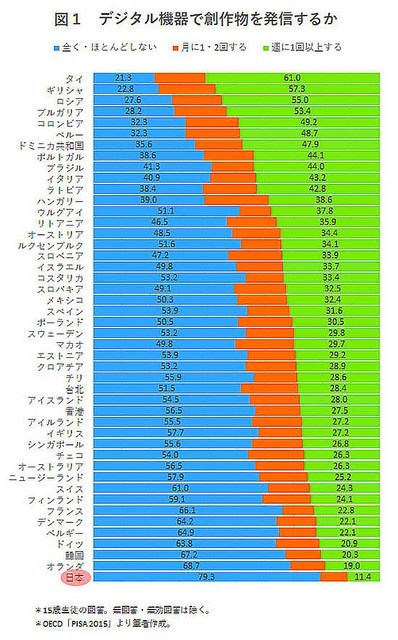 OECDの国際学力調査「PISA 2015」では、15歳の生徒に「学校外において、デジタル機器を使って、自分の創作物(created contents for sharing)をネットにアップするか」と質問している。「週1回以上」の比率が高い順に46カ国を並べたが、日本はわずか11.4%で最下位。日本の青少年は、ネットで創作物を発信する頻度が世界で最も少な い。全体の8割が、全くないしはほとんどそれをしていない。彼らはよくスマホを眺めているが、情報を受け取るばかりで、自分から創作して発信する姿勢には 欠けているという結果が出ている。便利な道具としては利用しているが、創造性に繋がる利用をほとんどしていないと言えるだろう。参照記事