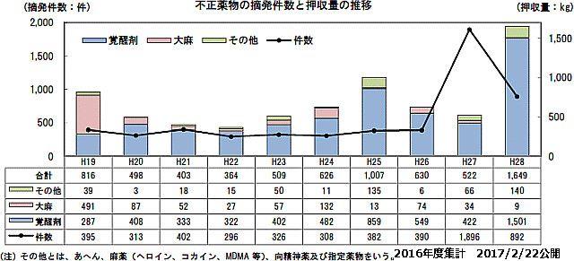 2017年2月26日:日本での2016年の覚せい剤押収量は約1,501