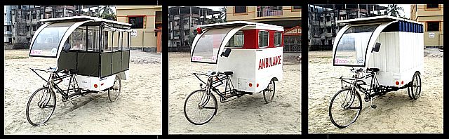 バングラデシュBangladeshのブラク大学BRAC University・電気電子工学部のAbdul Malek Azad教授らのグループが開発したソーラー・アシスト(補助モーター)三輪車。左が旅客用、中央が救急車、右が貨物用