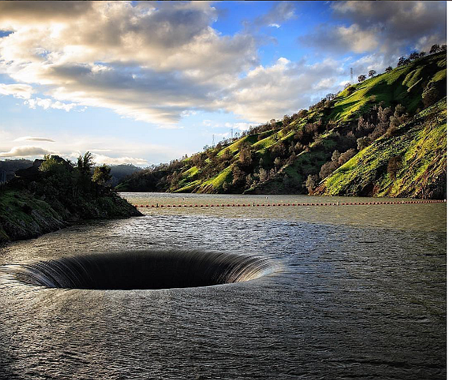 カリフォルニア州Californiaのダム「オロビル・ダム:Oroville Dam」のダム決壊の危険は回避したようだが、今も損壊した排水路からの排水は続いていて、下流住民の不安な日は解消されていない。写真は、米カリフォルニア州ベリエッサ湖Lake BerryessaのモンティセロダムMonticello Damの神秘的にも見える写真で、ダムの貯水域の直径22mの巨大な穴から水が流れ落ちている。ドローンによる記録映像