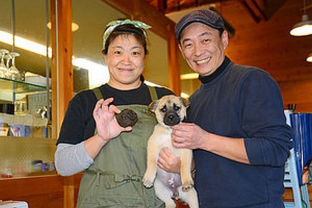 高知県馬路(うまじ)村の「うまじのパン屋」の愛犬きなこ(メス、生後2カ月)が雑木林で見つけた謎のキノコ。においや形から「トリュフでは?」と村で評判だったが、遺伝子解析の結果、いわゆる食用の「黒トリュフ」だったことが判明した。県中央西林業事務所の荒尾正剛さんが外部機関に遺伝子解析を依頼した。荒尾さんは、マツタケの人工栽培の研究に取り組んだ経験があり、日本特用林産振興会のきのこアドバイザーでもある。解析の結果、キノコはイボセイヨウショウロの一種で、その中でも「黒トリュフ」と一般に呼ばれているものと遺伝子が一致した。今回は「Tuber sp.7」「同sp.6」の2種の黒トリュフで、同じ場所から2種類が発見された事例は珍しいという。