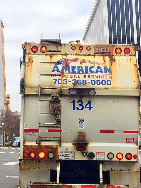 写真のアライグマraccoonが話題になっているという。参照記事アメリカ・バージニア州ロズリンで2017年2月17日朝、アライグマが走行中のゴミ収集車のハシゴにしがみついているところを、たまたま後ろを走っていたメディアの記者が目撃し、ドライバーに通報した。