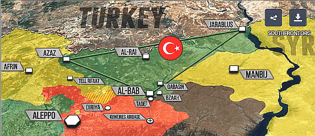 2017年2月24日:シリア北部では、アルバーブAl-Bab南部(トルコ国境から25キロ)地域までトルコ、トルコ支援のFSAが制圧したと23日確認された。市の南部には東西に走る重要な幹線道路があり、東西のクルド勢力にとっては重要な戦略地域で、このままトルコの覇権が維持できるとも思えない 参照地図(上の左の図の拡大図)。 23日時点での記事では、トルコ軍はアルバーブから数キロ南東部にあるTadif(Tadef,Tedef)のISに向けてロケット砲攻撃を行っていると報道されている。シリア政府軍も同じ場所へ西から進撃しており、微妙な地域である。トルコ軍は、西部クルド制圧地のAzazでも軍事衝突、もしくは砲撃を行なっていて、少しでも、主張するセーフゾーンを広く取りたいとの意向のようだ。上の左図で、緑の太い曲線で示したのが、23日時点でのシリア政府軍とISの戦闘中地域とされるが、この地域から右のユーフラテス川まで、アレッポの給水パイプが延びており、アレッポの飲料水確保の意味もあると想像できる。 過去ブログ:2017年2月一線を越えたトルコとトランプ政権の出方に注目