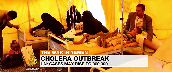 2017年6月25日:コレラ感染 cholera epidemicが、これまでに例がない勢いで蔓延しているとされるイエメンYemenで、4月下旬からこれまでに1310人の死亡が確認され、すでに20万人以上が感染しているが、8月下旬までには、感染者は30万人に達する可能性があるとWHO:World Health Organizationが発表した。コレラは、汚染された水や食料から伝染する、伝染性の非常に高い細菌伝染病で、治療は可能だが、戦争による国内の混乱がそれを困難にしている。