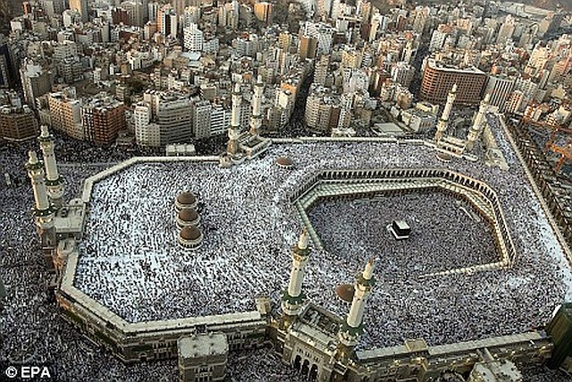 大モスクは世界最大のモスクで、イスラム教の聖地であるカーバ神殿(Kaaba 、 Ka'aba=The Cube):写真右下の黒い建物 を取り囲んでいる。