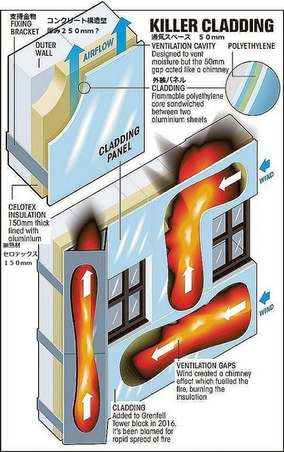 が、安いポリエチレンが採用されたとの記事もある。 使用図に、筆者の判断も含む日本語説明を加筆した。図では、内部火災の高熱が通気スペースに流入し、その結果、外装パネルのポリエチレンが燃え上がり、結露防止の通気用の隙間50mmが煙突となり全体に燃え上がったと説明されている。参照記事鑑識作業の終了には年末までかかる可能性もあり、「残念ながら、すさまじい熱のせいで、死亡した全員を発見できなければ、身元特定もできないかもしれない。ひどい話だが、これが現実だ」と警視は説明した。火災では少なくとも79人が死亡した恐れがあり、タワー棟の近くの集合住宅も含め、151戸が焼失した。現在専門捜査官250人の態勢で捜査に当たっており、警察は、業務上過失致死や防火基準違反など