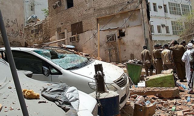 爆発の影響で男が潜伏していた建物の一部が崩壊:左。サウジ通信の関係者はCNNに、外国人6人が負傷し病院に搬送されたほか、治安要員5人も軽傷を負ったと明かした。今回の計画への関与が疑われる男女5人が逮捕された。内務省は、メッカを拠点とする2組織と西部ジッダJeddahの1組織が襲撃を計画したとしている。記録映像