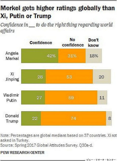 アメリカの世論調査機関ピュー・リサーチ・センターは2017年6月26日、トランプ大統領への信頼度に関する調査結果を公表した。調査は、世界37カ国の4万人以上を対象に実施。「世界情勢に対して正しい行いをしているか」などの観点から、トランプ政権への信頼度confidenceや評価について調べた。アメリカ、ドイツ、中国、ロシアの4カ国のリーダーに対する信頼度を比較したところ、一番高かったのはメルケル首相で42%だった。習近平国家主席が28%、プーチン大統領は27%といずれも低い評価を受けたが、トランプ氏は22%とさらに下回った。参照記事
