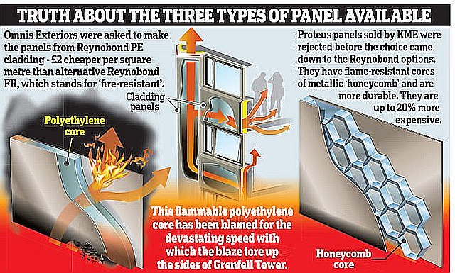 また、建物の外装材と断熱材が警察の安全性試験に合格しなかったという。警察が外装材と断熱材の安全性試験を行ったところ、いずれも基準値に満たず、試験では外装タイルよりも断熱材の方が先に燃えはじめ、燃え方も速かったという。右は6月22日付けの英国紙The Sunの記事からで、外装材Claddingなどが説明されている。前回の記事では、外装パネルの表材が亜鉛メッキ鋼板とする説明図を使ったが、The Sunの説明図では3mmのアルミ板でポリエチレン製芯材をサンドウィッチにしたパネルが使用されていたと説明されている。ポリエチレンは可燃性flammableだが、軽いのでパネルの補強芯材として使われているようだ。パネル芯材としては、アルミのハニカムHoneycombを挟み込んだ耐火不燃パネル:左 もある