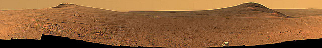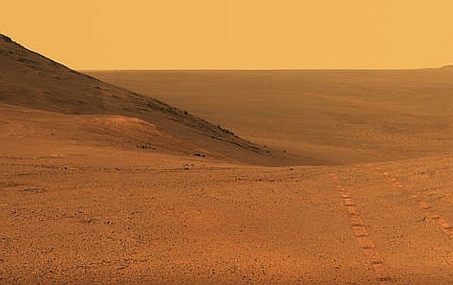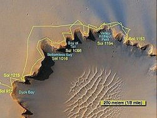 というのが去年2007年9月に書いた火星探査機オポチュニティーのブログだった。直径800mのビクトリアクレーターの淵で懸命に底に降りる経路を探していた。すでにこのとき、90日の探査機の寿命を3年半も延ばしていた。それから1年たった今2008年にニュースが入った。なんとオポチュニティーは生きていた。 それもクレーターの底部分の探査を終えてクレーターの崖を時間を掛けて登りきり平地に戻ったという。下の写真は左から、クレーターの周りで降下地点を探し ていたときの移動跡、真ん中はクレーターの崖の部分、下はクレーターから這い上がり平地部分へ戻った写真で、車輪の跡とクレーターの底が写っていいる。