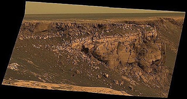一方のオポチュニティーは写真のようなロボットで、着陸時にクレー ターに落ちたが、それが不幸中の幸いで、地表断面を分析することが出来、思わぬ資料を地球へ送信した。自力で落ちたクレーターをやっと抜け出て、地表面を 走行中に砂地に車輪をとられ、あわやここまでと研究者があきらめかけた。科学者は地球上に同じ模型を作り懸命に火星の小さなロボットに指令を送る。しか し、どうしても砂地から脱出できないとあきらめかけた5ヵ月後に、この小さなロボットは自力で脱出に成功する。発電能力の落ちた太陽電池にむち打って必死 に働こうとするロボット、更に今月(2007年9月)、数日前に大きなビクトリアクレーターの淵に到達し、今その斜面を降りてまだ役目を務めようとしてい る。今、巨大なクレーターの内側と外側に足を乗せて止まっている。