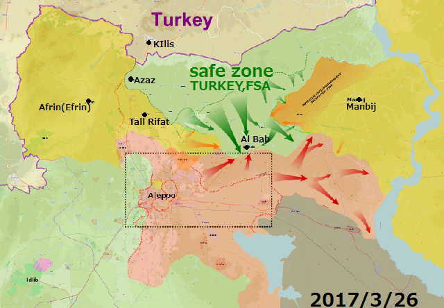 ロシア軍が、クルド支配地域に監視軍を派遣するのは初めてではないかと思うが、わずかでも緩衝地域(安全地帯 safe zone)拡大を狙うトルコに対し、現状でにらみを利かせる事ができるのはロシアだけだろう。SDFに武器支援し、トルコに批判的な米軍では余りにクルドに近過ぎ、新たな軍事対立を生みかねない。右下は2017年3月26日時点の、トルコ支援のFSAがユーフラテスの盾作戦と称して南下作戦を行なっていた時の侵攻図で、見比べれば、その後トルコ主張の緩衝地帯(安全地帯 safe zone)は大きく拡大していない。トルコとしては、現状で東西のクルド支配地域を十分に分離し、目的は達成したということだろうが、激しい攻防の末、Azazを緩衝地帯に取り込まれたクルド側としては、Tall Rifat地域制圧を狙うトルコを警戒し、この付近の軍事緊張が高まったためロシアが介入したと筆者は想像している。