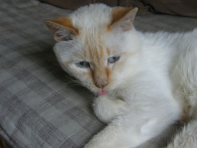 2017年8月27日:白猫のフーもいい歳になって、筆者のベッドの上で足枕で寝るか、ベッドの下の自分の寝室で寝ている事が多くなった。もっとも子猫の頃から毎日筆者とべったりな間柄で、もう一匹のミーが来ても余り遊んだりはしない。筆者の書斎兼寝室はフーの聖域で、この部屋にミーが来るだけで機嫌が悪くなる。外仕事から戻ると、ベッドの上でフーが寝ていた。鳥を撮るのにカメラを持っていたのでフーの寝姿を撮ると起きてしまった。起きた顔はまだ寝ぼけていて、舌が出たままだ。そんなフーの写真です。