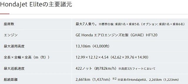 2018年5月28日;ホンダは28日、米子会社が製造・販売する小型ビジネスジェット機「ホンダジェット」を改良したと発表した。改良は2015年の出荷開始以来、初めて。8月から顧客への引き渡しを始める。改良機の名称は「ホンダジェット エリート」。燃料タンクを大きくし、航続距離を約2661キロと従来比17%延長(+396km)し、最大7人乗りで、燃費の良さが特徴。航続距離2661キロは、国内だけでなく、東京から中国・上海や台湾までノンストップで飛行できるという。エンジンの空気の取り入れ方も見直し、客室内の騒音を軽減した。7人乗りホンダジェットは約450万ドル(約5億3000万円)と同クラスでは高めだが、燃費性能の高さや機内空間の広さが特長。ホンダジェットの出荷機数は2017年に43機となり、米セスナ・エアクラフトやブラジルのエンブラエルが先行する中、軽量小型ジェット機としては世界で最も多かった。参照記事