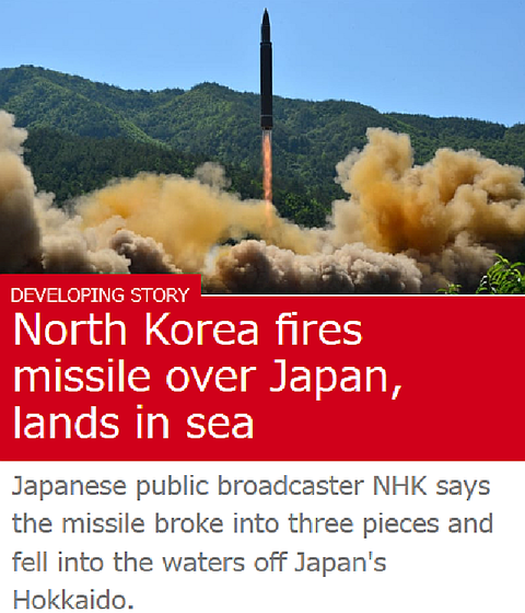 北朝鮮は2017年8月29日午前5時58分頃、同国西部から北東方向に弾道ミサイル1発を太平洋に向けて発射した。ミサイルは同6時6分頃、北海道の上空を通過し、同6時12分頃、襟裳岬の東約1180キロ・メートルの太平洋上に落下した。自衛隊は迎撃措置をとらず、航空機や船舶の被害はなかった。韓国軍合同参謀本部によると、平壌市順安(スナン、Sunan)一帯から発射。飛行距離は約2700キロ・メートルで、最大高度は約550キロ・メートルに達したという。JR東日本はミサイル発射の情報を受けて東北、上越、北陸の各新幹線と在来線の全線で安全確認のため一時運転を見合わせた。北朝鮮は8月10日に国営の朝鮮中央通信を通じて、4発のミサイルを同時に発射し、島根、広島、高知各県の上空を通過させた上でグアム島周辺30~40キロ・メートルの海上に落下させると予告していた。