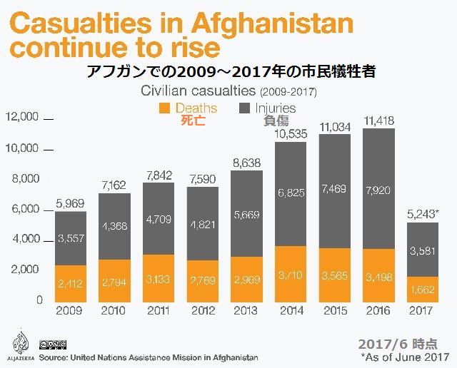 「犯罪組織」になっていると指摘し「選択肢は一つしかない。戦闘をやめ、罪のない市民の殺害をやめ、苦難や悲惨さをもたらすのをやめることだ。今こそ和平交渉に加わる時だ」と訴えた。最近決定した増派の規模は明らかにしなかったが(一部報道では、3900人規模といわれる。期日など未定)、航空戦力が戦闘に効果的だとしてアフガン空軍の増強に注力すると述べた。司令官は、タリバンの人的損耗はアフガン兵士を上回っているとしているが、米軍の2017年7月31日の報告では、2017年に入ってから5ヶ月間で、2531人のアフガン兵が戦闘で死亡し、4238人が負傷すると言う大きな損害を出している。