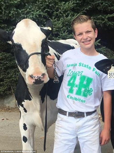 写真の少年ミシェルMitchell Miner君15歳と、メス牛のオードリー Audriが、アイオワ州で開催された家畜品評会の合間に疲れてうたた寝している写真が話題になったそうだ。写真を撮ったのは父親のジェレミーJeremyさん。父親を手伝う少年はオードリーと最近2ヶ月ほどは何時も一緒で、ミシェル君の役目は、毛の手入れや散歩、入浴させる事など。イベントの為、この日は早朝3時から起きていたそうで、両方とも相当に疲れていたようです。品評会の結果は残念ながら、競技参加7頭のうちの5位に入賞でした。オードリーは酪農場から借り出された牛で、イベントの後は酪農場へ返される予定でしたが、動物の権利保護の団体PETAが、保護施設での受け入れを申し出ているそうです。団体は、家畜にも幸せな生き方が約束されるべきで、少年も、友達のオードリーが搾乳場で牛乳を搾られる機械のように扱われよりは安心できるだろうと語っている。1枚の写真が、牛の人生を大きく変えるようです。一般的に家畜の牛には、出産も搾乳も出来なくなるとハンバーグにされる運命が待っています。参照記事