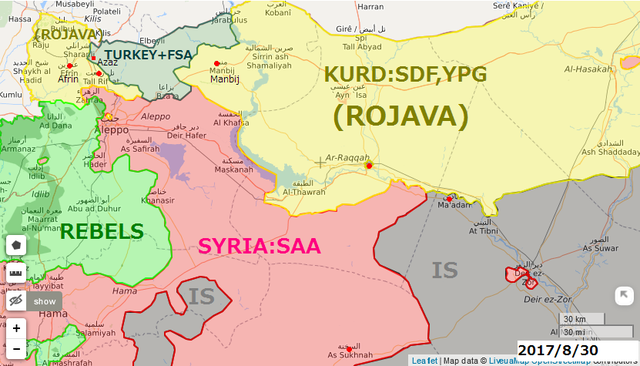 マンビジュManbijに駐留する米軍は8月29日、付近(恐らくマンビジュ北部)をパトロール中の米軍部隊が、トルコ支援のFSA兵士らから攻撃を受け交戦したと発表し、有志国軍としてトルコ側へ該当部隊へ攻撃を止めるように伝える要請をした。しかしトルコ側はそれを否定し、クルドYPG側が先に攻撃を仕掛けてきたので応戦した結果だと主張している。同地域ではこれまでも、トルコ支援の反シリア政権組織と、米国支援のYPG傘下のSDF間で、小火器による交戦がたびたび起きている。 参照記事 過去ブログ:2013年11月反政府側、シリアの油田地帯を制圧か シリア 2011年9月韓国 イラクでの油田、ガス田開発で大誤算 イラク 2008年1月イラク北部クルド人自治区と国際紛争(1)修正