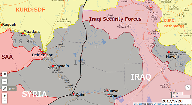 2017年9月24日:シリア軍SAAはユーフラテス沿いのMaadanを制圧し、ラッカからデリゾールDeir ez-Zorに至るユーフラテス川西岸地域を完全開放したと報じられた。すでにパルミラPlmyra~スフナフSukhnah~デリゾールDeir ez-Zor間のハイウェイを確保したシリア軍は、デリゾールへの食料、物資の補給を行なっている。その区間の解放後、アッシュ・シュラ居住地域 Ash SholahでISがハイウェイ補給路分断の攻撃に出でるが撃退されている。この区間は、約3年ISに制圧されていた。 参照記事 記事と映像上記の9月20日と右の26日の攻撃状況図を見ると、イラクのHawijaでは、西からイラク軍、東からクルド軍がISを追い詰めているようだ。またイラク軍は、Rawa,Anaでも進撃している。アンバル地域のISを南北に分断する作戦か?