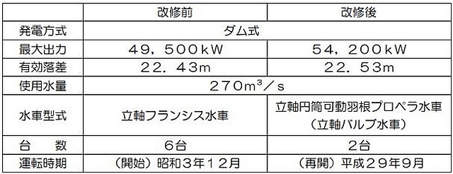 えることなく最大出力を4万9500kWから5万4200kWへ増加した。なお、有効落差は22.53m、使用水量は270Nm3となっている。さらに、ダム