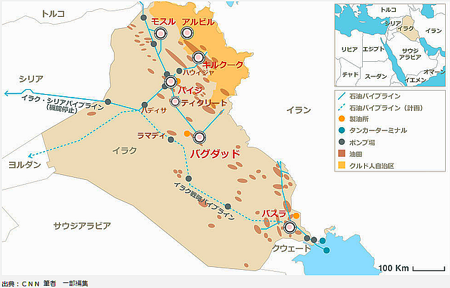 キルクーク一帯の油田の生産量は70万バレル(日量)といわれ、イラク有数の油田(左図の茶色)の1つ。当地の支配と権益をめぐっては中央政府とクルド自治政府との間で対立が続いてきたが、クルド自治政府の軍事組織ペシュメルガPeshmergaがキルクークをISから解放し、同地の支配を固めてきた。クルド自治政府には、キルクークからの石油収入を国家独立の原動力にしようという思惑が強い。フセイン政権が崩壊した後、クルド人は自治政府を発足させたが、シー