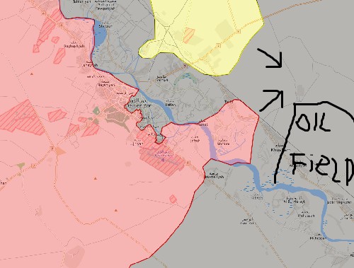 シリア軍はデリゾールDeir ez-Zor市街を制圧し、一部はユーフラテス川Euphrates Riverを渡って北東へ進撃し、クルドSDFの南下から、ISは東西に分断されるのは時間の問題だろう。シリア軍の北東への進撃は、左下の別図に在るように、シリア最大の油田地帯Oil fieldへ、黄色のク