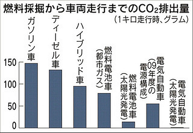 左の資料図では、太陽光発電の電気で充電の電気自動車がもっともCO2削減となっている。原発などが生み出す余剰な夜間電力の使用も、よりCO2削減とエコに近づける方策だろう。例外的ではあるが、大災害で送電が不可能になれば、その地域での充電は不可能になる。電気自動車完全普及までには課題が多く、トヨタなどが、保存の利く水素などの燃料電池車(FCV)の開発を進めるのもこの辺の理由だろう。 参照記事