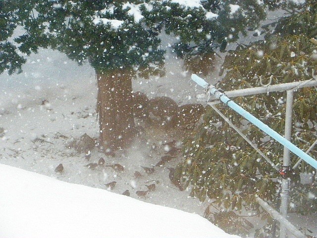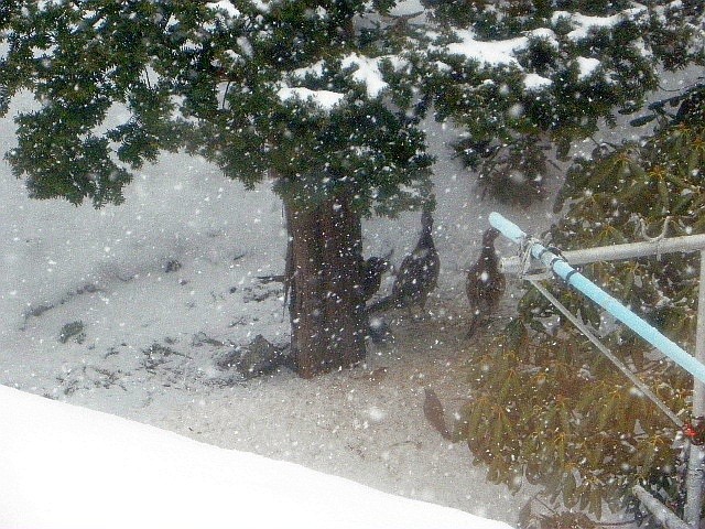 雪は1cmほど積もり、気温が高いので溶け始めているが、中庭には、まだ1mほどの残雪がある。これを書いていて中庭を覗くと、いつの間にか餌場に場所を移し、また降り始めた雪の中、残った餌をついばんでいる。早速外に出て餌の補充である。すぐにスズメやほかの鳥たちも集まった。キジたちには、今日は2回目の食事だ。この時間に2度目の食事は珍しく、雪に隠れる前に残った餌を食べようとしたのかもしれない。いつもは夕方近くに2回目を食べる。まだまだ習性を知るには観察が必要だ。家の前の川には、まだ地上に雪があるのに無数の子ガモ達が泳ぎ始めた。逞(たくま)しいな。