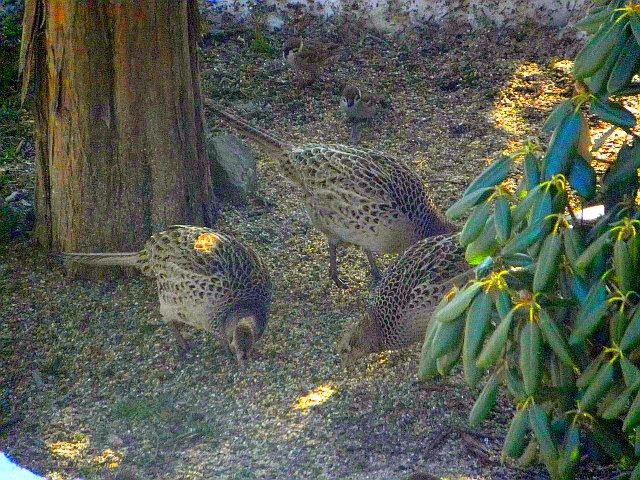 それにしても木の中のスズメは騒がしい。キジ3羽は食後、中庭の地面のくぼみや低木の下などで、うまく保護色で体を隠して毛づくろいなどをしている。