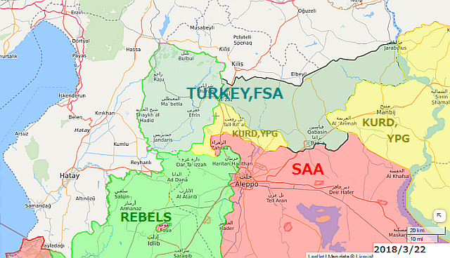 2018年3月22日のクルドメディアは、米国とトルコがシリア北西部の扱いについて協議し「マンビジュManbij及びユーフラテス西岸地域の安定の為、同地域に対する相互理解を得るに至ったが、最終的な決定合意にまではなっていない: we reached an understanding, not an agreement」と報じている。外交記事としては分かりにくく、相互理解の程度に終わったとも、協議は不調だったとも取れるが、両国が先の地域の扱いについて、決裂や対立にならなかったのは確かなようだが、トルコの米国への不満は高まっている。