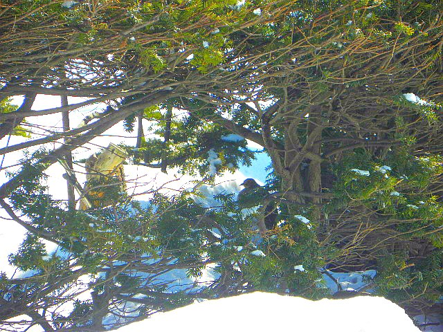 春の日差しを感じる2018年3月24日、中庭の雪も急速に融けつつある。野鳥やキジの餌場である大きなオンコの木の中には20~30羽のスズメたちが、チュンチュンと騒がしい。ツイッターのマークが小鳥なのも、デザイナーがこの鳥たちの呟きを聞きながら思いついたのかもしれない。筆者の仮説だが、、。