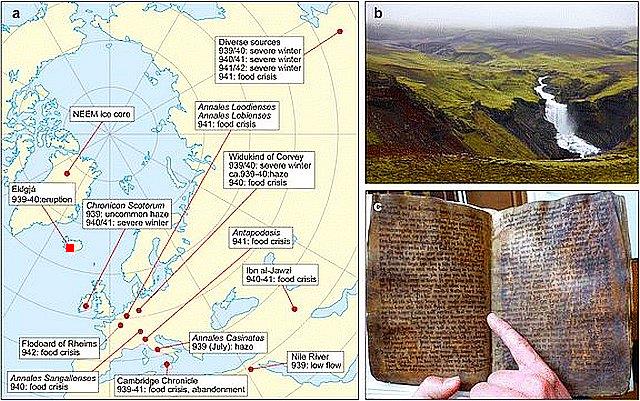 アイスランドにあるエルトギャゥ火山 Eldgjá volcano(エルトギャゥとは、英語でfire canyon、火の峡谷の意味)の大型の噴火Eldgjá eruptionは、バイキングが突然カトリック宣教師の言葉を信じ、10世紀に改宗した主な要因の1つとなった。論文は科学誌『Climatic Change』に掲載された。地図aは、噴火の位置と、当時寒冷化や食糧危機が確認された地点と年代、現在はbの様に穏やかな渓谷となっている。
