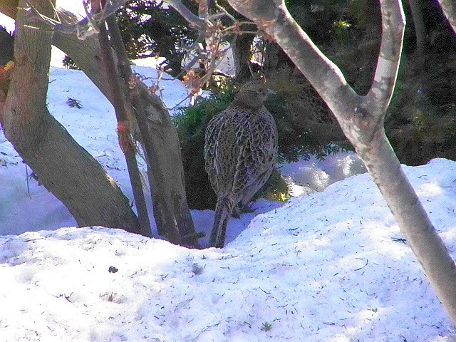 2018年3月20日:朝8時、雪が降り風が多少あるので、キジは来ていないと思いながら、多少の雪など気にもしないで雪をかぶりながら餌を待つスズメ達に餌をやり、戻って2階から見下ろすと、すでにキジ3羽が餌を食べている。餌を撒く前の確認では、いつもの垣根の下には姿が無く、その後飛んできた気配も無いので、中庭のどこか別な場所で夜を過ごしていたようだ。雪が止んだ正午、外に出て遠回りに双眼鏡で調べると、垣根から離れた大きな石が集まった根元あたりにいるのが分かった。その辺には大きなくぼみが沢山あるので、身を隠すのに最適なのだろう。