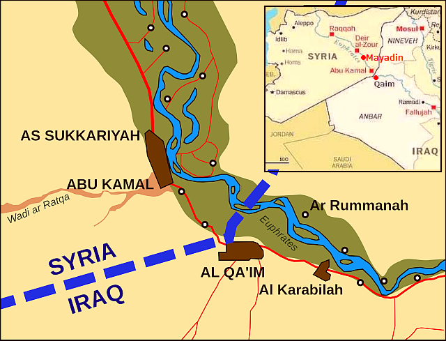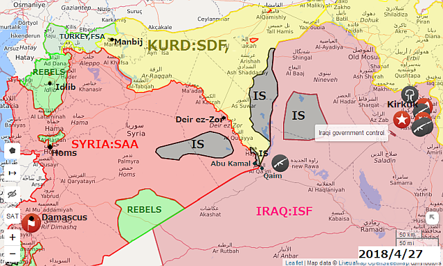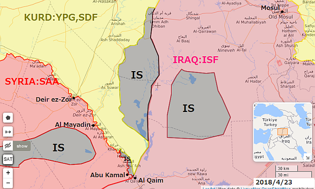 領内へ4月19日にF-16による空爆を行い、ISの指揮官6人を含むIS36人を殺害したと報じている。この作戦には、米、有志国軍からイラク空軍へ情報の提供が行なわれた。最近、Al Mayadinでシリア軍とISの間で激しい戦闘があったと言われ、ISがAb Kamal方面からDeir ez-Zor方面、あるいはAl Madin占拠に向け進撃している可能性がある。過去2017年10月には、ロシア空軍もMayadeen(Mayadin)とAlbu Kamal(Abu kamal)へ大規模な空爆を行い、24時間で200人近いISを殲滅している。
