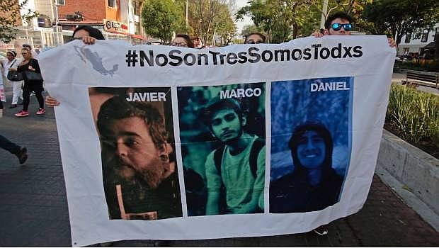 今回のターゲットになったCDNは、残虐な処刑をする事でも有名だ。今回の作戦では同時に複数の場所から、大量のマリファナ、コカイン、合成麻薬、ロケット砲、手榴弾、TNT火薬なども押収されている。血なまぐさい犯罪の相次ぐメキシコでは最近、行方不明だった学生3人が麻薬組織に殺害され、酸で溶かされていた事が判明している。犯行は、ここ数年で有力麻薬犯罪組織に成りあがったカルテル ハリスコ ヌエバ ヘネラシオン(CJNG)だとされている。右は、犯罪への抗議デモで掲げられた学生3人の写真で、3人は麻