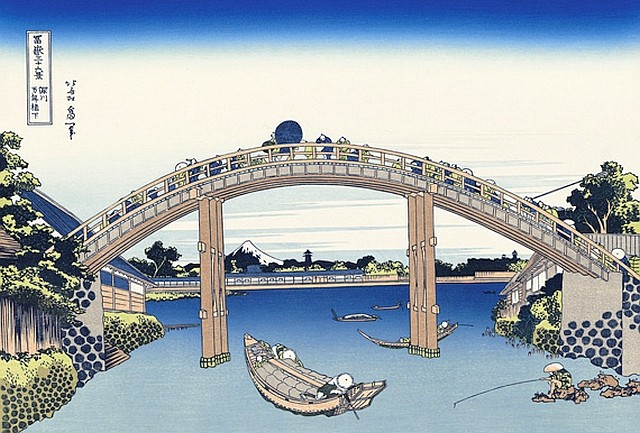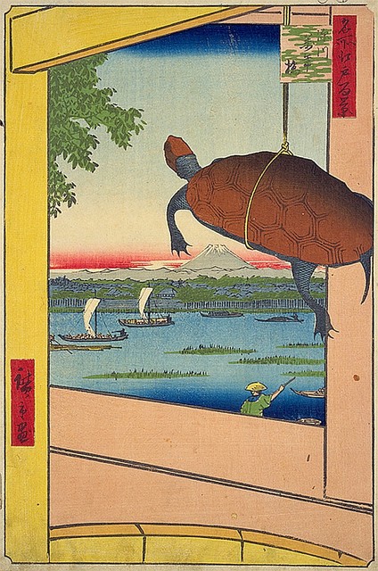 亀といえば萬年(万年)、その名を冠する深川萬年橋に描かれた通称「吊るし亀」は、実は(亀売りの)手桶の持ち手からぶら下げられている亀のこと。亀が見ているのは、西の方角にある江戸の町、そしてその先の富士山です。萬年橋は大川(隅田川)にそそぐ小名木川(おなぎがわ)の河口近くに架けられ、通常より急なアーチの太鼓橋:下 だったので、富士山を仰ぐ絶好のビューポイントでした。対岸は、現在の「日本橋中洲」周辺、首都高速の箱崎ジャンクションあたりと言われる。広重独特の構図で、富士山、万年橋、亀がそろった縁起のいい絵です。参照記事 参照記事 参照記事