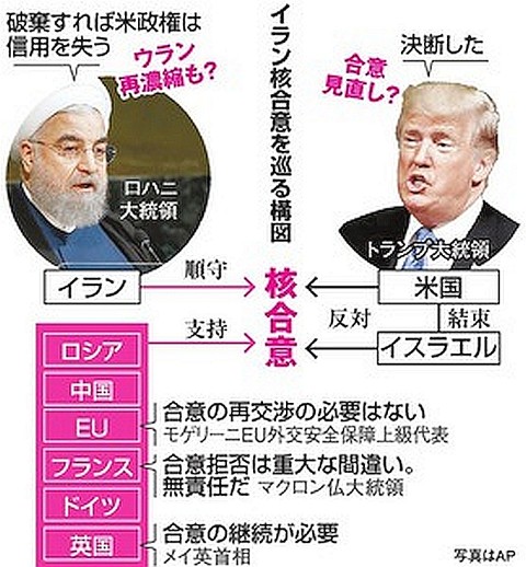 ところが、トランプ政権は2018年5月にこの合意を破棄。全面的な核廃棄でなければ受け入れられない、という方針を採り、これは米国の保守派に多い、根深い反イラン感情を汲み上げたもので、大統領選挙の公約でもあった。イラン敵視が鮮明なイスラエルやサウジアラビアなどスンニ派諸国との伝統的な同盟関係を重視するトランプ政権は、歴代世間のなかでも反イランの立場が鮮明だ。しかし、トランプ政権による核合意の破棄は、イランから見て一方的過ぎるもので、現状でイランのハッサン・ロウハニ(Hassan Rouhani)大統領は英・仏・独・ロ・中の5か国とともに核合意に残留する姿勢だが、米国の対イラン圧力が強まった場合、核開発が逆に加速する恐れは十分にある。ただし、それは米国の「イランが脅威」という主張を補強し、イラク侵攻と同じく一方的な先制攻撃の口実を与えることにもなりかねない。そのため、イラン政府も簡単に方針転換はできず、トランプ政権が続く限り対立が度合いを増しながら継続していくと見られている。参照記事 参照記事